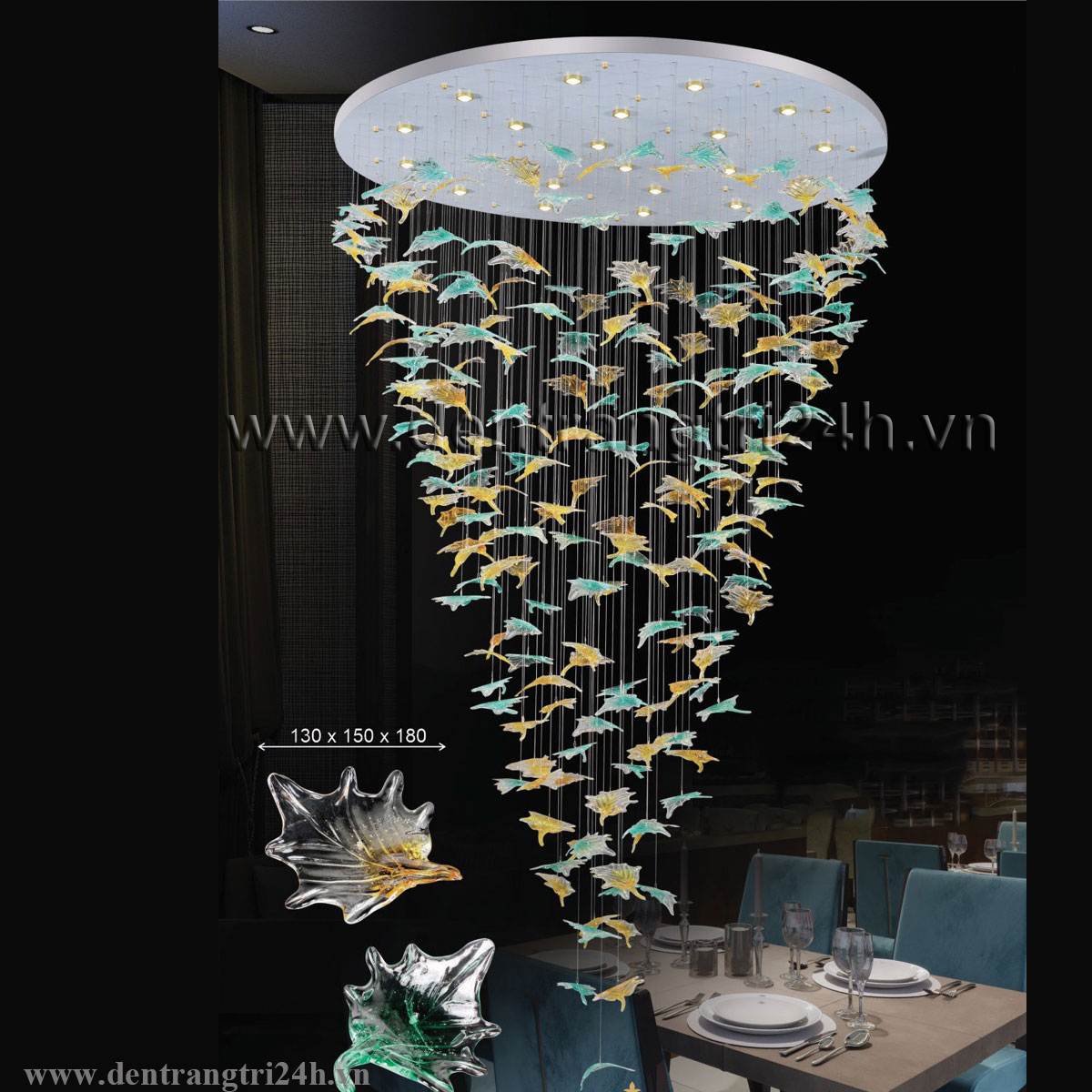 Đèn Thả pha lê chiếc lá đường kính 1,5 mét dài xuống 3 mét HP22 TL 1606 Ø1500xH3000