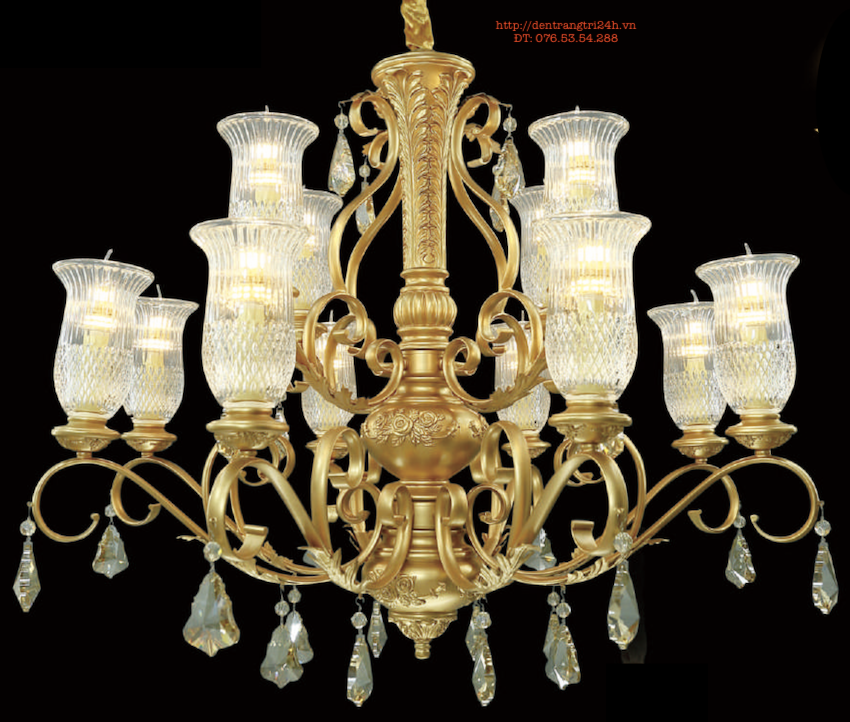 Đèn Chùm 2 tầng màu vàng đồng 12 chao thuỷ tinh phong cách tân cổ điển CH12/8+4