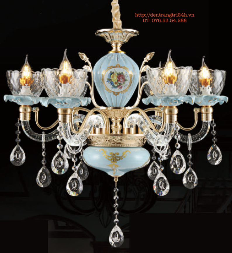 Đèn Chùm sứ thiên thanh 6 chao thuỷ tinh phong cách indochine 8605/6